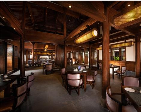 沒(méi)有繼續(xù)延續(xù)內(nèi)室的宮燈使用,而是別出心裁的使用描紅紙傘來(lái)對(duì)內(nèi)室做一番裝飾點(diǎn)綴,如此別出心裁的設(shè)計(jì),可見(jiàn)設(shè)計(jì)師的非凡設(shè)計(jì)功底,懸吊在半空中的群傘裝飾,不僅有效的將內(nèi)室空間等比例分割開(kāi)來(lái),更是為內(nèi)室營(yíng)造出一種別致的婉約美感,仿佛是那青石板上想起的零丁聲響,自那暈開(kāi)的水滴之間,恍然見(jiàn)到一俏麗女子模糊花顏,巧笑倩兮,美目盼兮,顧盼之間蕩出的是千年凝萃的詩(shī)畫(huà)風(fēng)流。
